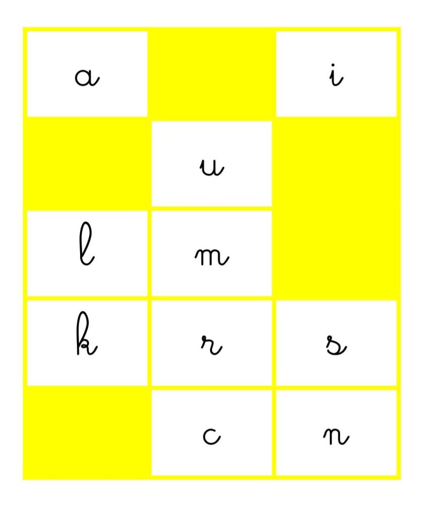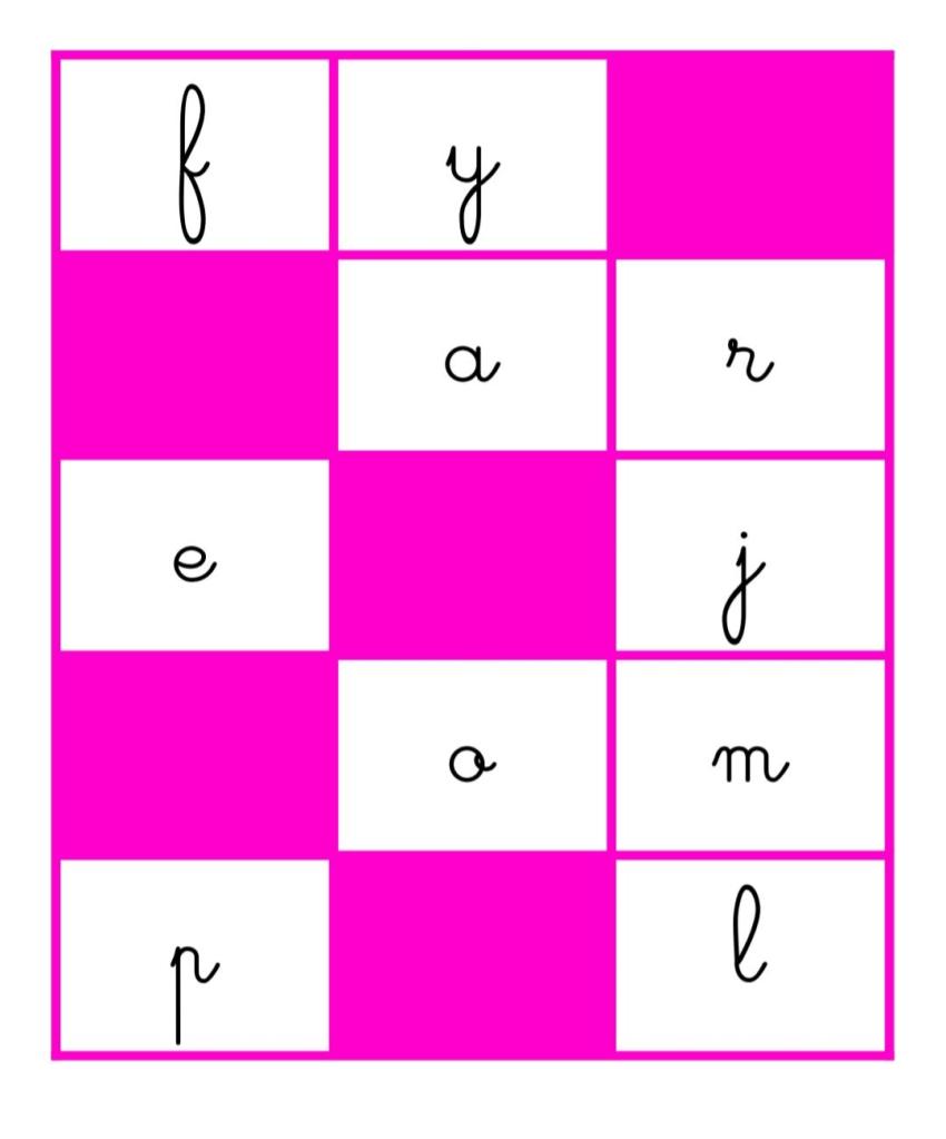 Les cartes sont en lettres cursives. Vous pouvez ( au choix ) dire le nom de la lettre, dire le son de la lettre, montrez une lettre en capital ou en script et les élèves doivent retrouver la lettre correspondante sur leur carte. Plusieurs modalités de jeux possibles…