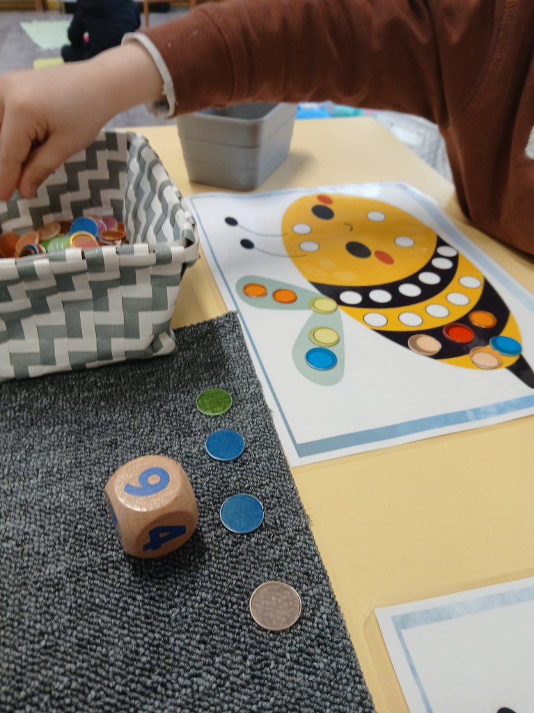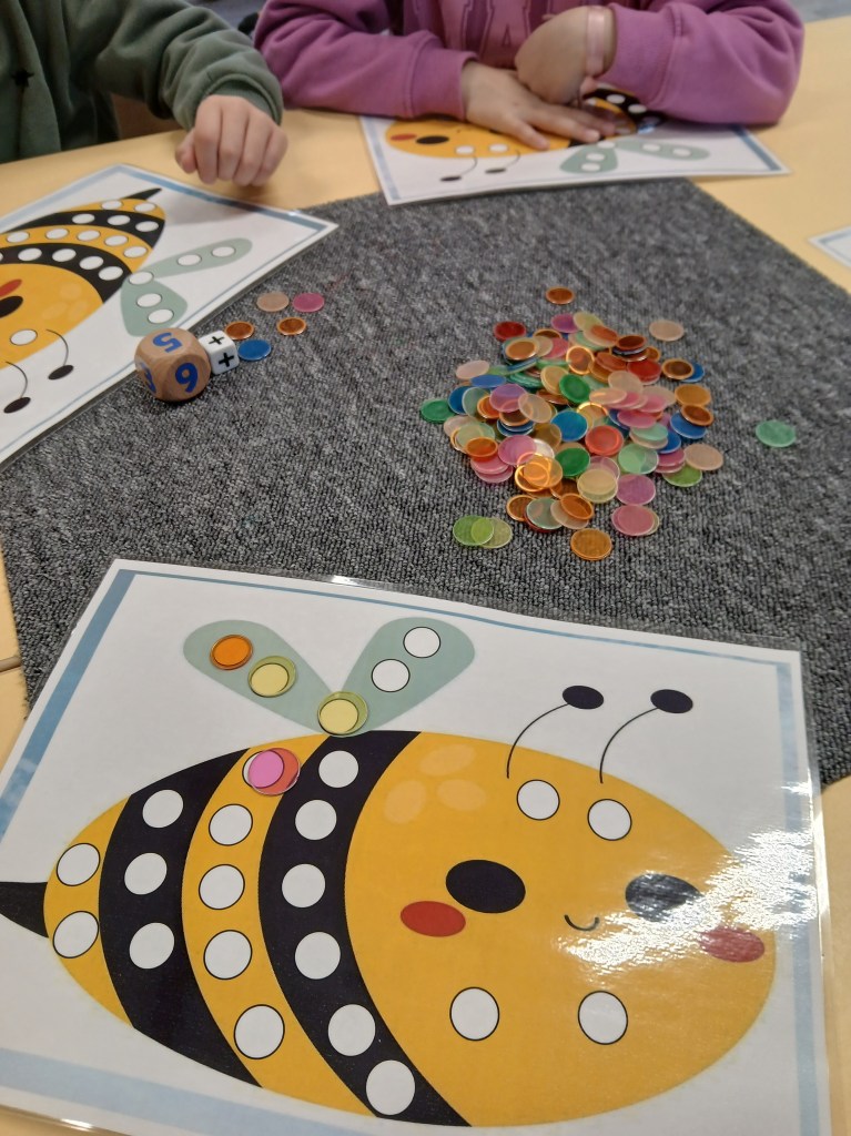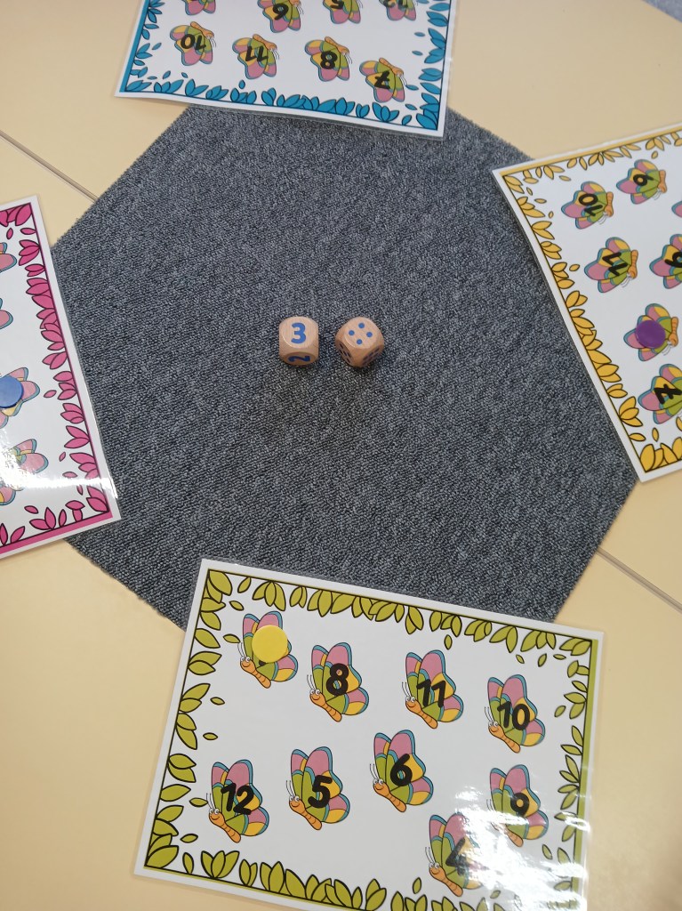 🌈 En grande section, les enfants vont travailler avec 2 dés : 1 dé avec les signes + et – pour apprendre à ajouter et retirer de petites quantités. L’autre dé est un dé chiffré de 1 à 6. A chaque lancer , l’élève ajoute ou enlève le bon nombre de jetons. Le jeu se termine lorsque la plaque est complète.