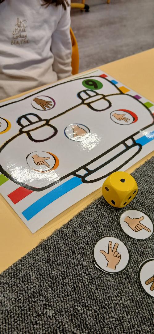 Ce jeu permet de travailler les différentes représentations des nombres de 1 à 6 avec les GS ( chiffres, constellations, représentations des doigts). Une fois le dé lancé, l’élève doit prendre la représentation des doigts qui correspond et poser la carte sur le chiffre correspondant.